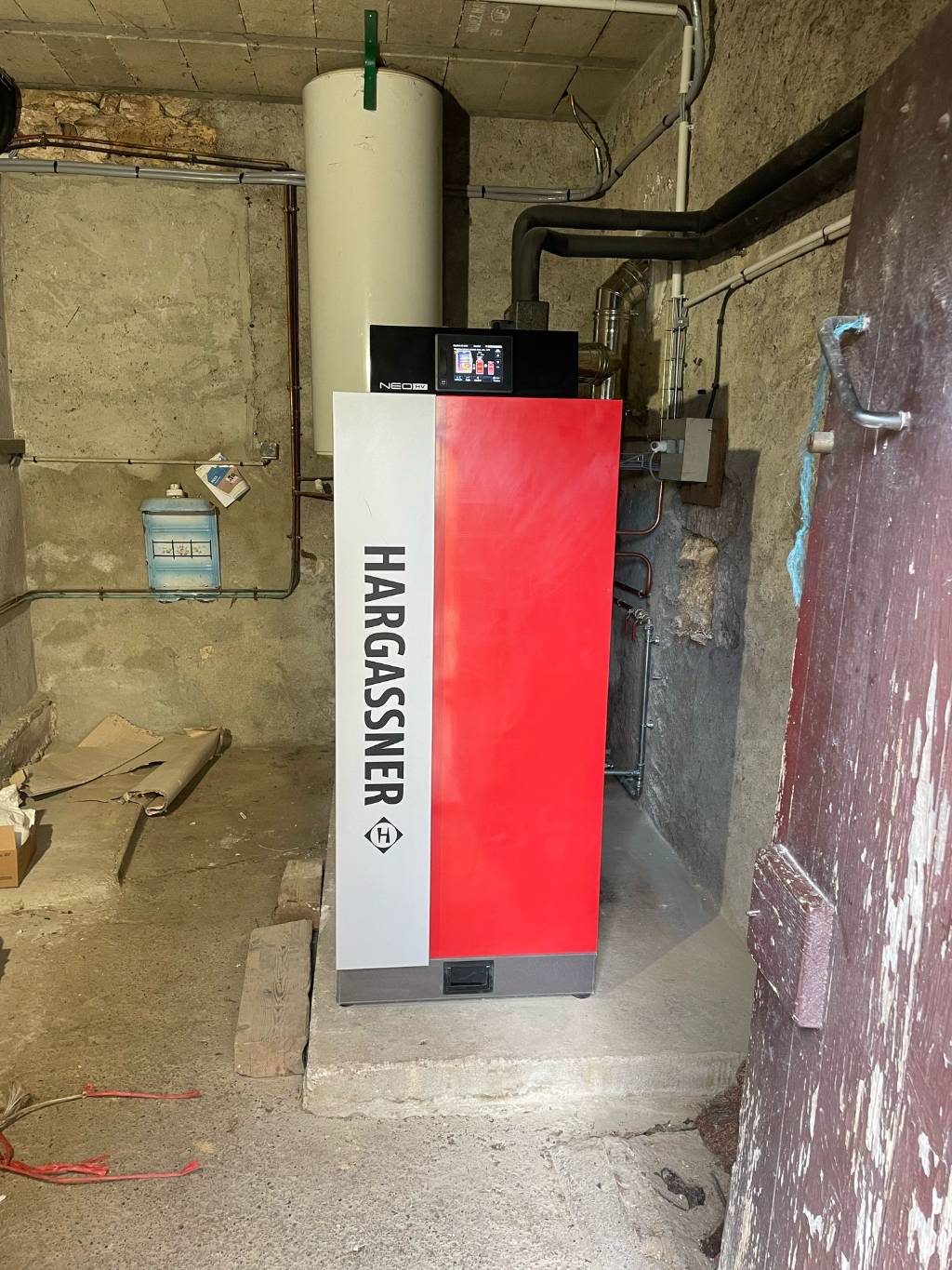 Après étude du logement et des besoins en chauffage, nous avons installé une chaudière bois bûche Hargassner Neo-H20, adaptée aux bûches de 50 cm, avec production d’eau chaude sanitaire intégrée.