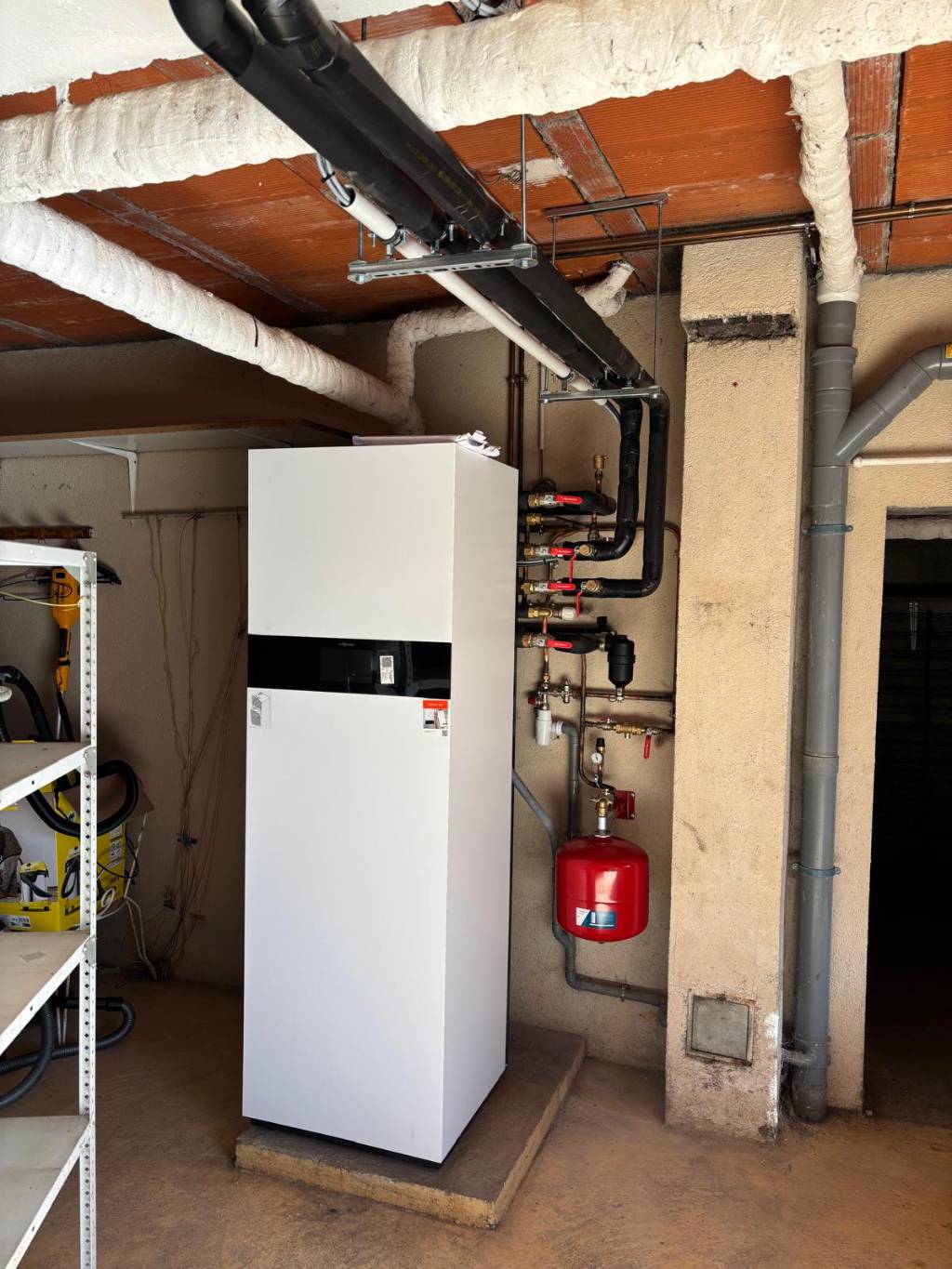 Nous avons réalisé le remplacement d’une chaudière fioul qui alimentait un réseau de radiateurs par une pompe à chaleur air/eau Viessmann Vitocal 151-A, avec production d’eau chaude sanitaire intégrée.