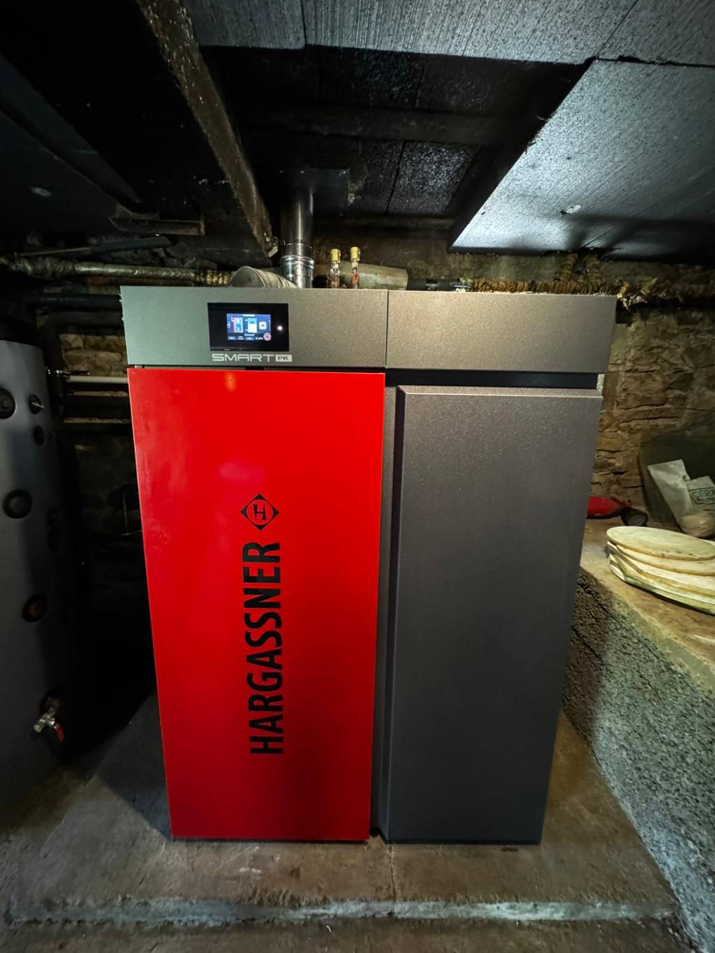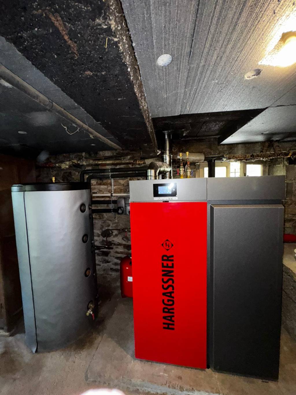 Après la dépose de l’ancienne chaudière, nous avons procédé à l’installation de la chaudière Hargassner Smart PK17 d’une puissance de 17 kW, puis à son raccordement sur le réseau en place. L’ensemble a été mis en service avec les réglages nécessaires afin d’assurer un fonctionnement adapté aux besoins du logement. La production d’eau chaude sanitaire n’est pas assurée par cette installation, celle-ci étant déjà prise en charge par un équipement indépendant.